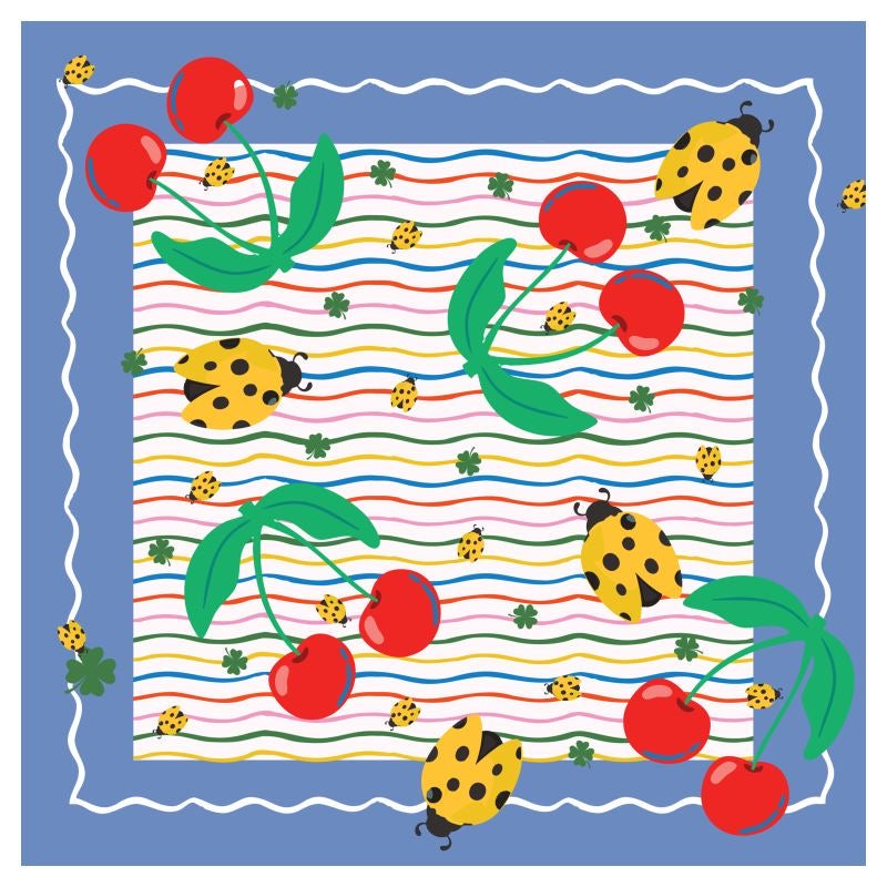 This limited-edition print is the second in our collaboration with Luisa Rangel de Alba, founder of Fait à Main and former painter for Goyard. A master of playful composition and graphic clarity, Luisa designed Lucky Cherry as a visual fever dream: bright cherries, yellow ladybugs, rainbow squiggle stripes, and clovers that feel equal parts charm and glitch.